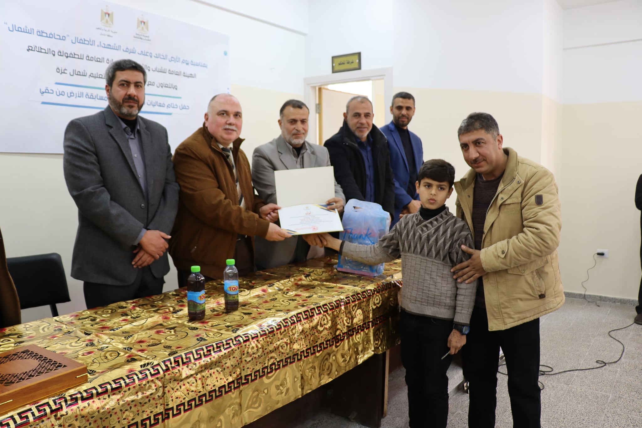 على أنغام أهازيج العودة، وكلمات الشوق والحنين لفلسطين، الهوية، والعقيدة، والتاريخ...، احتفلت مديرية التربية والتعليم في شمال غزة، وبالتعاون مع الهيئة العامة للشباب والثقافة- الإدارة العامة للطفولة والطلائع، باختتام فعاليات "شهر القراءة"، والمسابقة الثقافية "الأرض من حقي" (للوطن حكاية)، وذلك على شرف ذكرى يوم الأرض الخالد، وشهداء الشهداء الأطفال في محافظة شمال غزة.